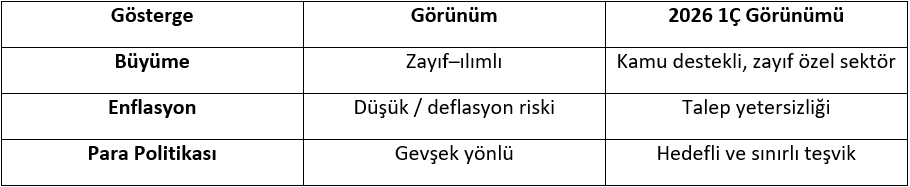 Çin’de büyüme kamu harcamaları ve seçici teşviklerle desteklenirken, özel sektör ve hanehalkı talebi zayıf kalmaya devam ediyor. Enflasyon tarafında talep eksikliği ve emlak sektöründeki durgunluk deflasyonist baskıları canlı tutarken, para politikası genişleyici olmakla birlikte finansal istikrar kaygıları nedeniyle agresif değil. Bu görünüm, 2026’nın ilk çeyreğinde güçlü bir toparlanmadan ziyade kontrollü ve parçalı bir iyileşmeye işaret ediyor.