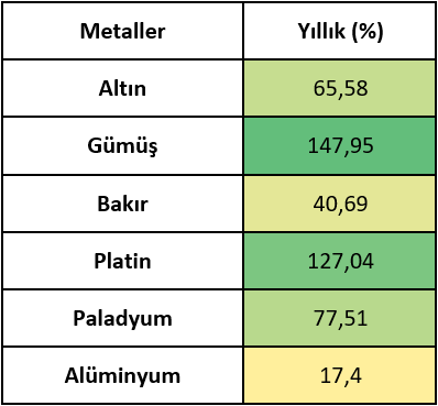 Metallerdeki ayrışma, 2025 yılında seçiciliğin ön planda olduğunu gösterdi. Altın güçlü performansıyla portföyde dengeleyici rolünü korurken, sanayi metalleri arz sıkışıklığı nedeniyle oldukça hareketliydi. Platin ve Paladyum tarafında talep kanadından çok arz gelişmeleri etkinliğini hissettirdi.