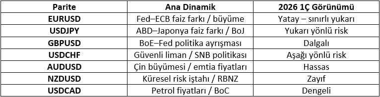 EURUSD paritesi Fed – ECB ayrışmasının daralması yukarı yönlü hareket alanını mümkün kılsa da sınırlıyor. USDJPY paritesi BoJ’un temkinli duruşu nedeniyle yukarı yönlü risk potansiyelini koruyor. GBPUSD paritesi ücretlerin neden olduğu politika belirsizliği ile yön arayacakken, USDCHF paritesi güvenli liman talebindeki zayıflama sağlandığı takdirde yukarı yönde ilerleyebilir. NZD ve AUD Çin ve emtia kaynaklı gelişmelere açık olacakken, CAD tarafında petrol fiyatlarının seyri takip edilecek. İlk çeyrekte döviz piyasasında performans daha çok merkez bankaları ayrışmaları ve emtia fiyatlarıyla yön bulabilir.