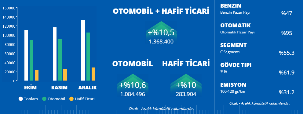 Türkiye otomobil ve hafif ticari araç toplam pazarı, 2025 yılı Ocak-Aralık döneminde bir önceki yılın aynı dönemine göre %10,49 oranında artarak 1.368.400 adet olarak gerçekleşti. Açıklanan son veriler ışığında otomobil ve hafif ticari araç toplam pazarı 2024 yılına göre rekor satış rakamına ulaşmış oldu. Otomobil satışları, 2025 yılı Ocak-Aralık döneminde geçen yıla göre %10,62 oranında artarak 1.084.496 adet, hafif ticari araç pazarı ise %9,97 artarak 283.904 adet oldu.