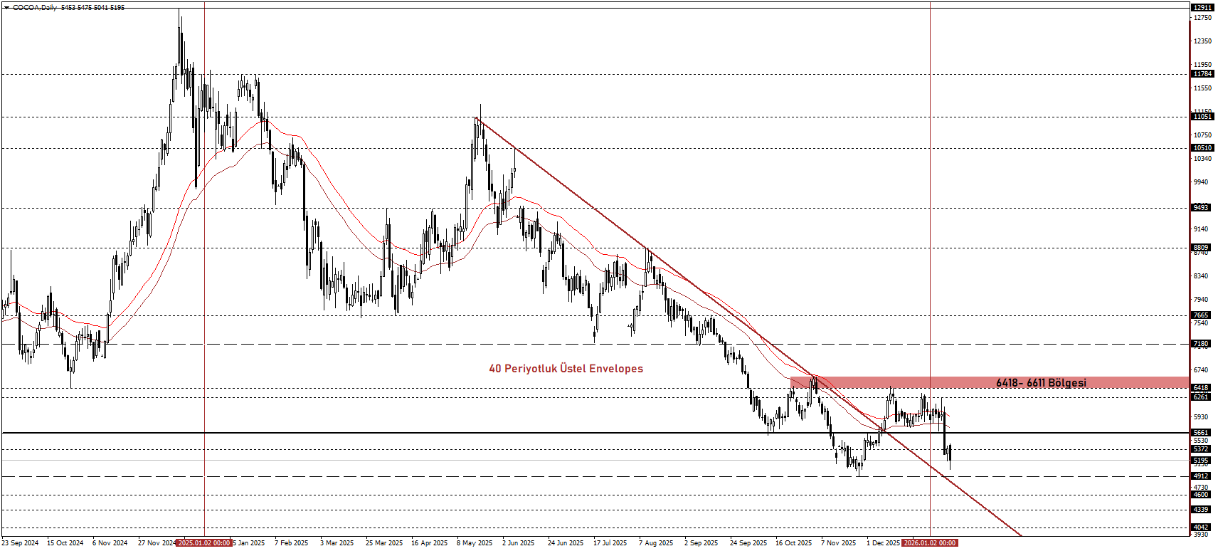 4912 dip seviyesinin ardından 4661–6418 bandında izlenen yatay seyir, kakaonun Bloomberg emtia endeksine dönüşü sonrası artan satış baskısıyla birlikte yönünü yeniden aşağı çevirdi.