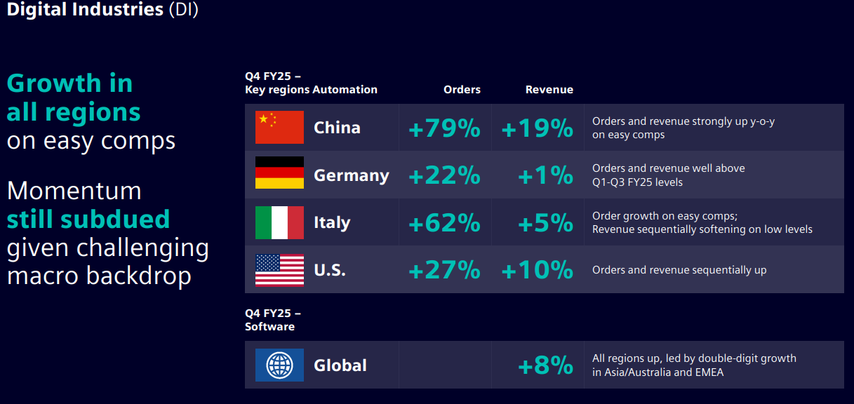 Global büyüme açısından: Siemens, özellikle Çin, Hindistan, Amerika, Avustralya ve EMEA bölgelerinde dengeli büyüme kaydetmiş olup, 2025'te karşılaştırılabilir gelir artışı %5 civarında gerçekleşmiştir; sürdürülebilirlik ve dijitalleşme trendleri küresel talebi desteklemektedir.
