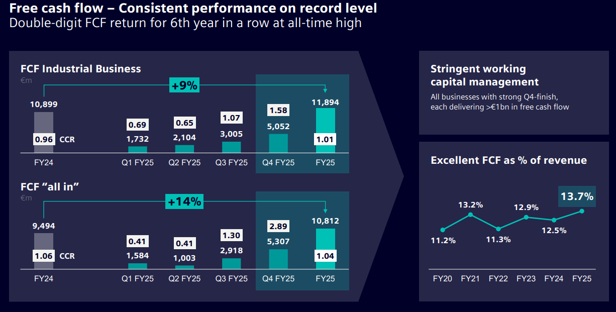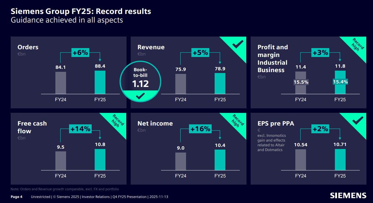 Siemens, FY25 sonuçlarında tüm temel finansal metriklerde beklentilere paralel ve güçlü bir performans sergileyerek rehberliğini eksiksiz biçimde gerçekleştirmiştir. Siparişler yıllık bazda %6 artışla 88,4 milyar €’ya yükselirken, 1,12 seviyesindeki book-to-bill oranı talep görünümünün sürdürülebilirliğine işaret etmektedir.