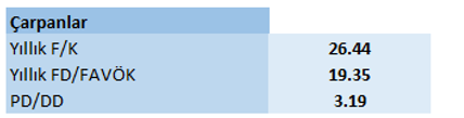 Şirketin cari fiyat/kazanç oranı yaklaşık 26.50 civarında işlem görürken, sektör ortalamasının ve medyanının altında, bu da göreceli olarak iskontolu bir çarpanla fiyatlandığını gösteriyor. Firma değeri/FAVÖK oranı 19.35 olarak, medyandan düşük seviyede konumlanıyor.