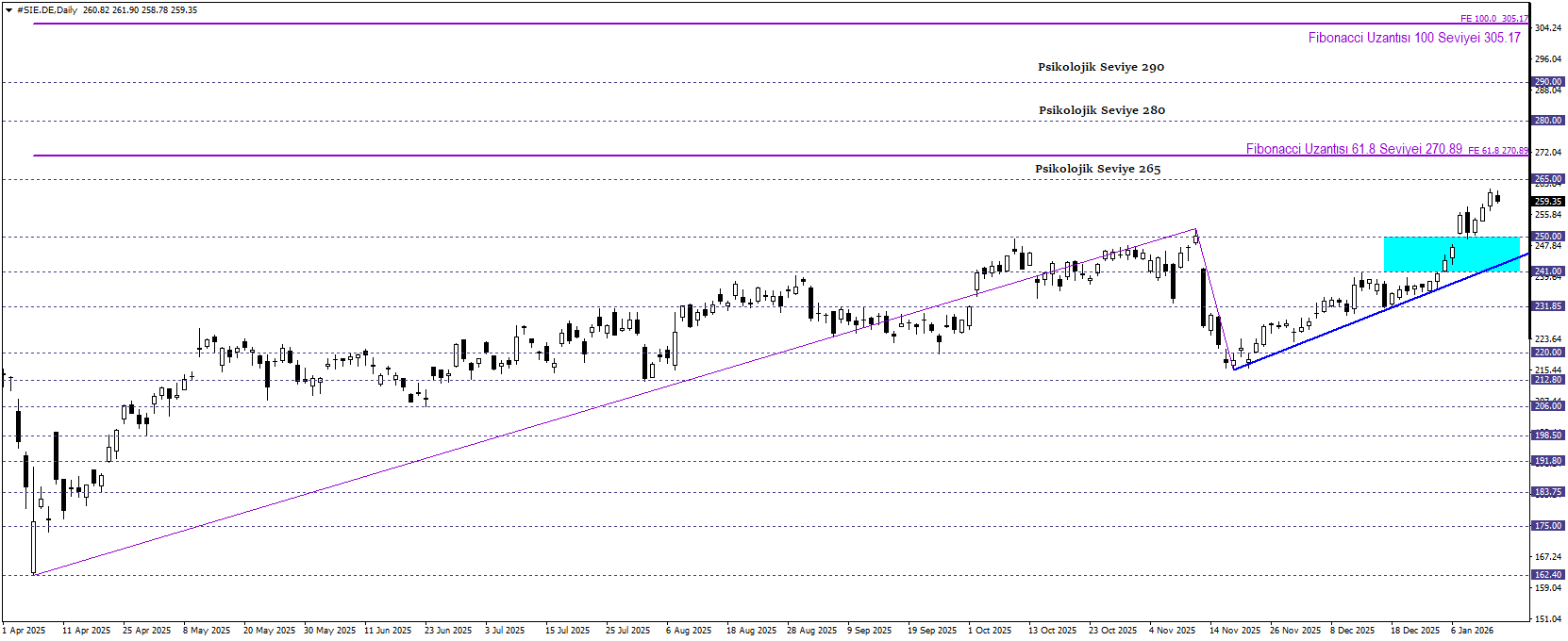 Siemens hissesi uzun vadede yükseliş eğilimiyle rekor seviyelerini tazelerken pozitif teknik görünümünü güçlendirerek olumlu görünümünü koruyor. Hisse trend eğrisinin de destek ayağı olduğu 241,00 – 250,00 bölgesinin üzerinde fiyatlanmayı sürdürdükçe, Fibonacci 100 seviyesi olan 305,17 seviyesine doğru yukarı yönlü potansiyelini koruyabilir. Takip edilen bölgenin ve trendin altına geçilmesi geri çekilme hareketini başlatabilir ve 206,00 seviyesine doğru hareket gerçekleşebilir.