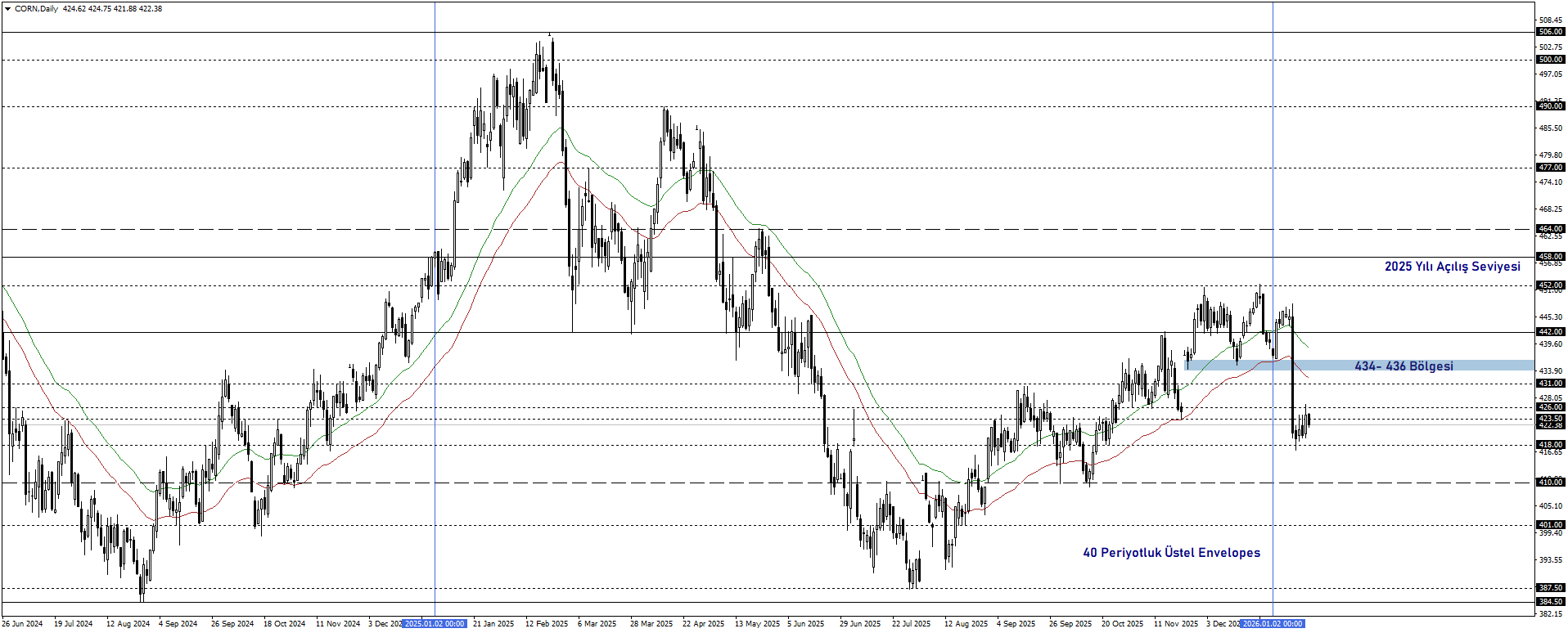 2025 yılının ortasından itibaren toparlanan mısır fiyatları, 2026’da görülen sert satış dalgasının ardından yeniden 40 periyotluk üstel Envelopes göstergesinin altına geriledi.