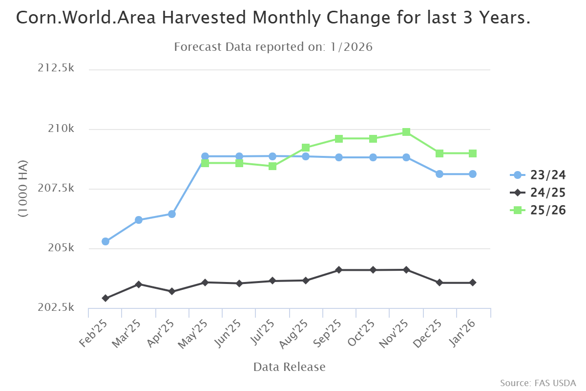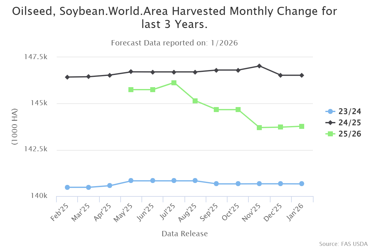 Son üç sezona ait aylık güncellemeler, soya fasulyesi ekim alanının mısıra kıyasla daha sınırlı bir bantta hareket ettiğini gösteriyor. 25/26 sezonunda ise küresel soya fasulyesi ekim alanı önceki iki sezona kıyasla daha düşük bir seviyede izlenirken, sezon ilerledikçe aşağı yönlü revizyonlar belirginleşiyor