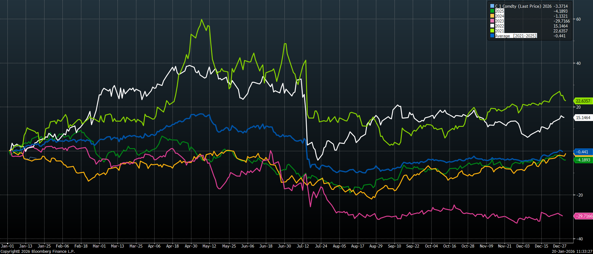 Mevsimsellik grafiği, mısır fiyatlarının tarihsel olarak ilkbahar aylarında (Mart–Mayıs) görece daha güçlü bir performans sergilediğini, yaz aylarında (Haziran–Ağustos) ise hasat beklentileriyle birlikte baskı altına girdiğini gösteriyor. Sonbahar döneminde arzın netleşmesiyle birlikte zayıf seyrin devam ettiği, yılın son çeyreğinde ise sınırlı toparlanmaların öne çıktığı görülüyor.