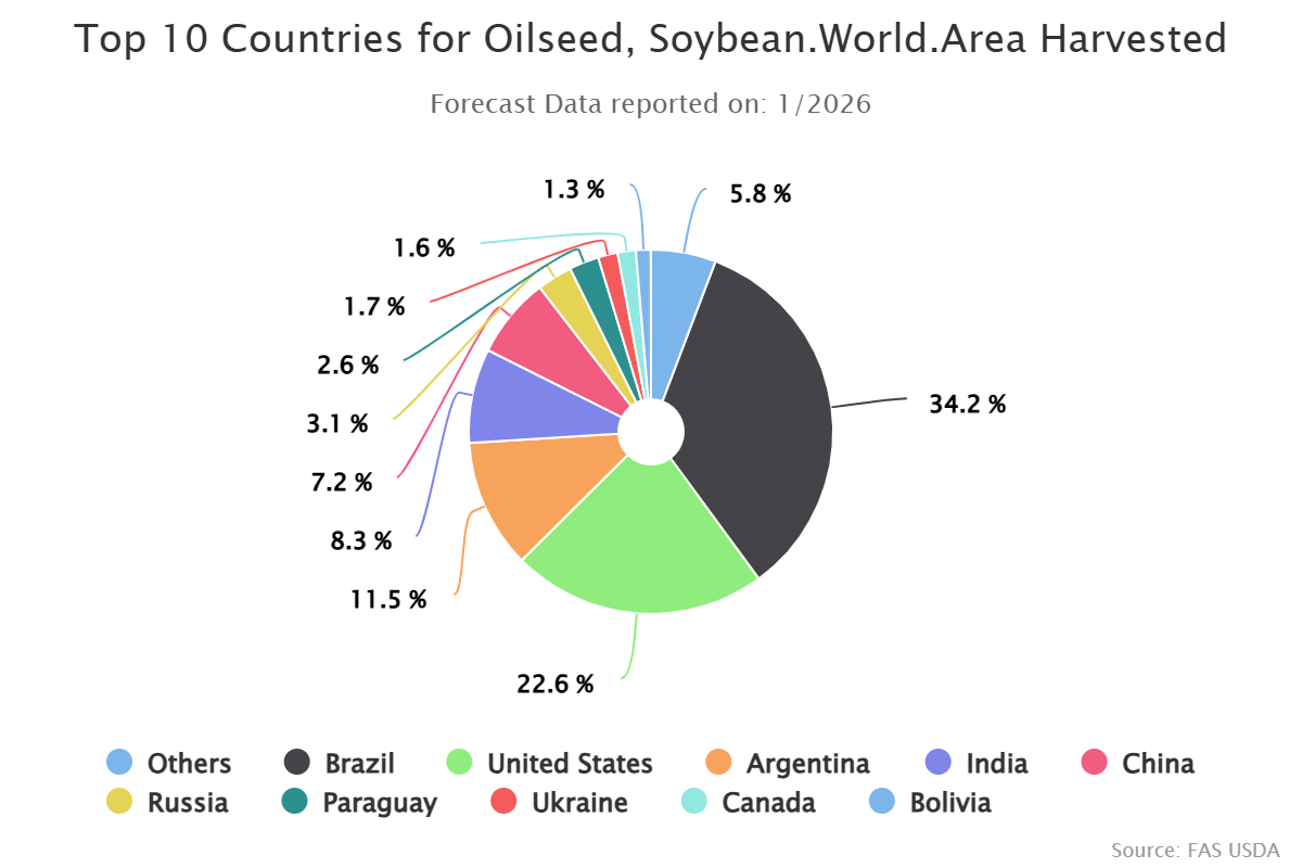 Küresel soya fasulyesi ekim alanının büyük bölümü Brezilya ve ABD’de yoğunlaşmış durumda. Bu yapı, Brezilya kaynaklı üretim ve hasat beklentilerinin küresel soya fiyatları üzerinde belirleyici rol oynamaya devam ettiğini gösteriyor.