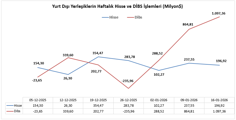 12 – 16 Ocak haftasında yurt dışında yerleşik kişilerin piyasa fiyatı ve kur hareketlerinden arındırılmış hisse senetleri net değişimi 196 milyon 920 bin dolar olarak gerçekleşirken yurt dışında yerleşik kişilerin piyasa fiyatı ve kur hareketlerinden arındırılmış DİBS (Kesin Alım) net değişimi 1 milyar 97 milyon 360 bin dolar olarak gerçekleşti.