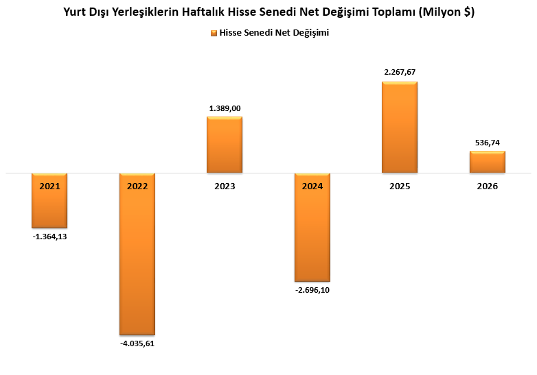 Yıllık bazda hisse senedi net değişimlerine ayrıca bakıldığında, yabancı yatırımcıların 2021 ve 2022 yıllarında hisse senetlerinde net satım gerçekleştirdiği, 2023 yılında ise alım tarafında yer aldığı görülmektedir. 2024 yılı da 2021 ve 2022’ye benzer şekilde net satımla negatif tarafta tamamlanmıştır. 2025 yılında ise dikkat çekici bir artışla yabancı yatırımcıların yeniden alım tarafında yer aldığı görülmektedir. Diğer yandan, 2026 yılının başından itibaren 16 Ocak ile biten hafta itibarıyla hisse senetlerinde 536 milyon 740 bin dolar tutarında alım gerçekleştiği izlenmektedir.