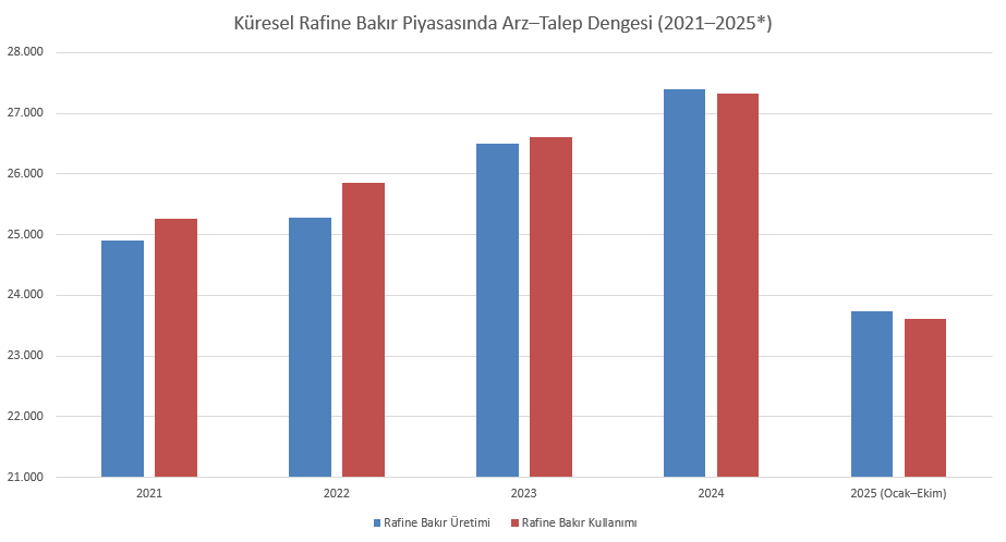 Not: 2025 verileri Ocak–Ekim dönemini kapsamakta olup, grafik rafine bakır piyasasının yapısal dengesini göstermek amacıyla kullanılmıştır.