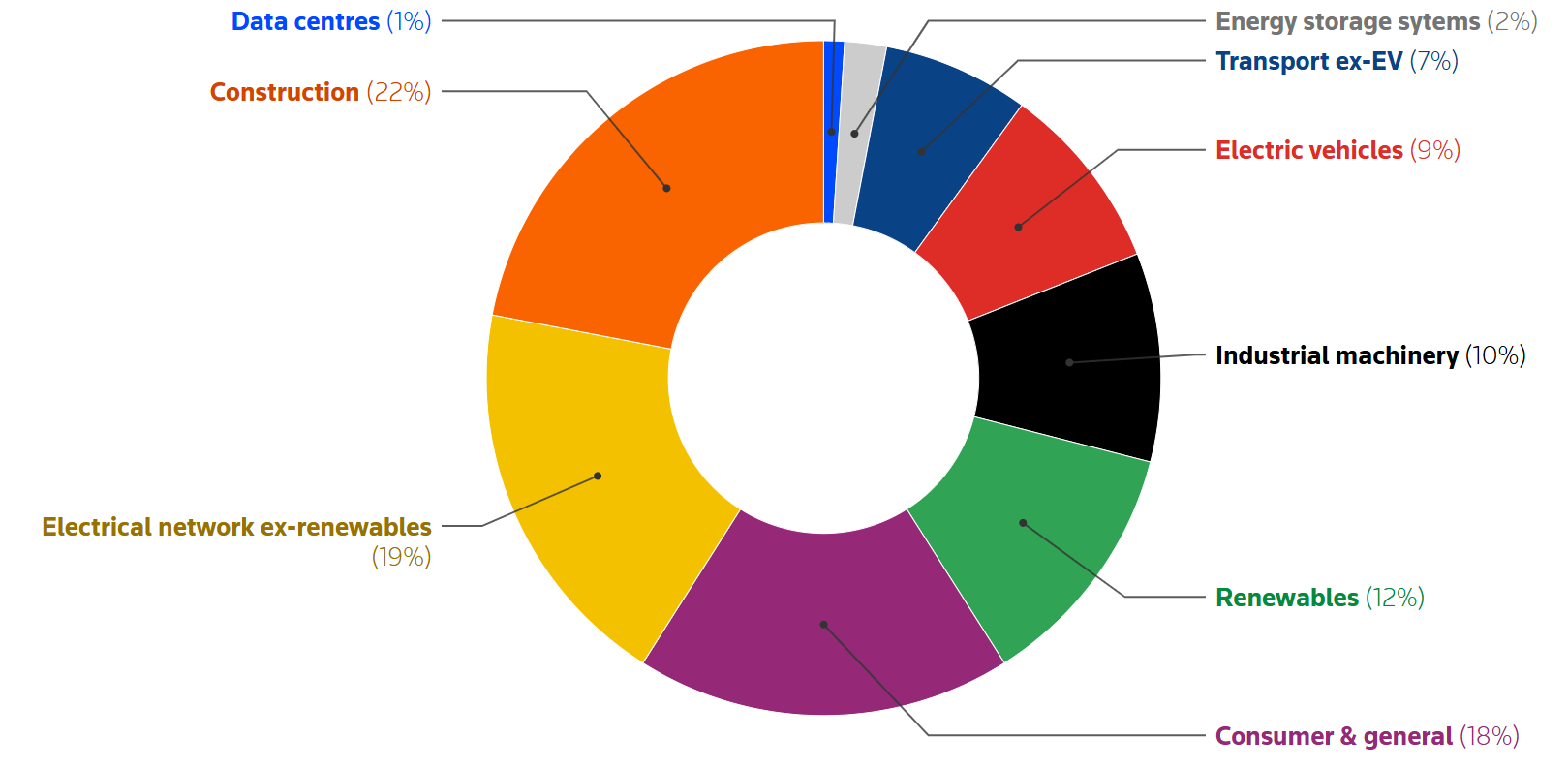 Bakır talebinin sektör bazlı dağılımı, enerji dönüşümü ve elektrifikasyon temalarının büyüdüğünü ancak inşaat ve şebeke yatırımlarının hala toplam talebin ana omurgasını oluşturduğunu gösteriyor.