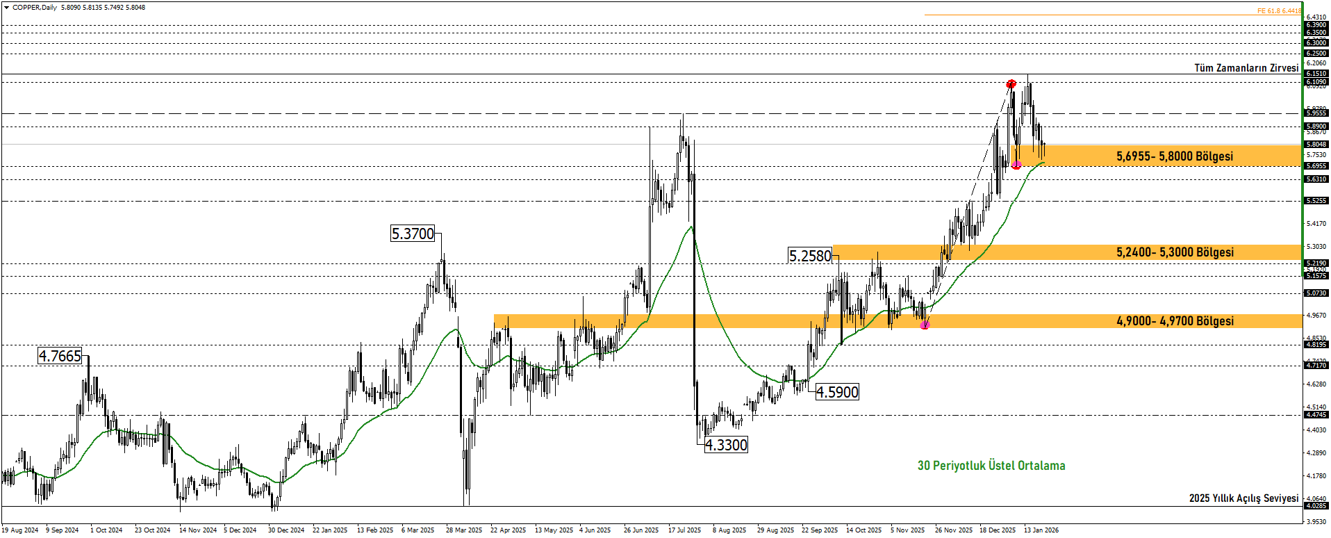 Alternatif Senaryo: 5,6955–5,8000 bölgesinin ve 30 periyotluk üstel ortalamanın altında gerçekleşecek mum kapanışları, düzeltme hareketinin derinleşmesine neden olabilir. Bu senaryoda ilk olarak 5,5255, ardından 5,2400–5,3000 bölgesi gündeme gelebilir.