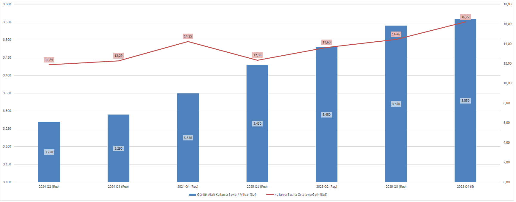 Dolayısıyla şirketin kullanıcı sayısı ve kullanıcıya bağlı gelirleri, şirket gelirleri açısından yüksek önem gösteriyor. Meta, bu uygulamalarında toplam 3 milyar 540 milyon kişiye ulaştı ve yıllık bazda %7,6 oranında büyüme gösterdi. Kullanıcı başına ortalama gelir ise 14,46 dolar olurken, bu değer yıllık bazda %17,66 oranında artış yaşadı. 2025 yılı dördüncü çeyreğinde; kullanıcı sayısının yıllık bazda %6,23 oranında büyüyerek 3 milyar 558 milyon kişiye ulaşılması ve kişi başına ortalama gelirin yıllık bazda %13,8 oranında artışla 16,22 dolar seviyesinde gerçekleşmesi bekleniyor.