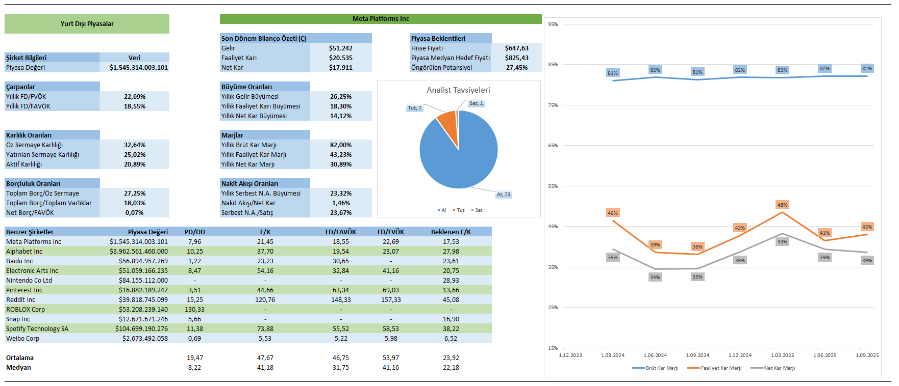 Bu yapıyla Meta, piyasa tarafından 1,5 trilyon doların üzerinde bir değer ile fiyatlanıyor. Cari F/K çarpanı 21,45 ve FD/FAVÖK çarpanı 18,55 ile benzerlerinin medyan değerine kıyasla daha makul çarpanlara işaret ediyor. Uzun dönem beklentilerin dahil edildiği, beklenen F/K çarpanıyla da benzer konuma işaret ediyor.