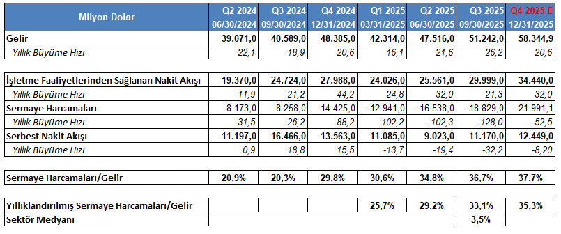 Şirketin marjlarını yıllık değişimlerle ele aldığımızda, son çeyreklik dönemde genel olarak soğuyan bir performans söz konusu oldu. Geçen yılın aynı döneminde bürt kar marjı %18,9’dan %26,2’ye yükselirken; faaliyet kar marjı %38,7’den %35’e düştü. Net kar marjı ise %38,7’den %35’e gerileyen bir görünüm çizdi. Bu durum şirketin operasyonel anlamda verimliliğinde göreceli bir yavaşlamaya işaret edebilir.