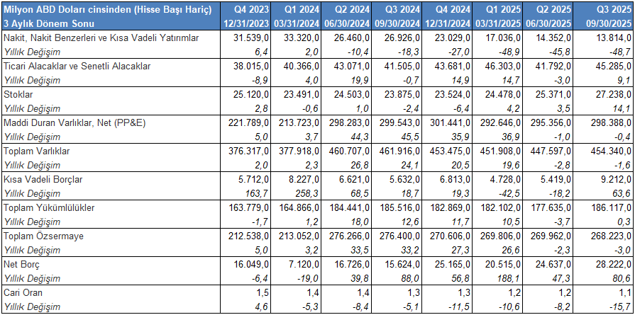 Likidite tarafında en dikkat çekici unsur, nakit pozisyonundaki sert erimedir. Nakit ve nakit benzerleri yıllık %48,7 azalarak 13,8 milyar USD’ye gerilemiş, cari oran ise 1,14 seviyesine düşmüştür. Buna paralel olarak kısa vadeli borçlarda %63,6 artış görülmesi, borç vadesinin kısaldığını ve mevcut faiz ortamında refinansman riskinin yükseldiğini ortaya koymaktadır.