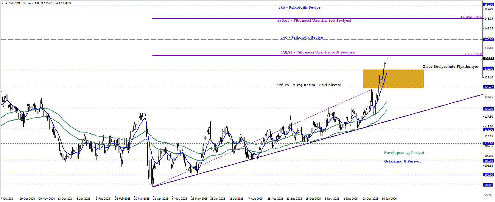 Exxon Mobil hissesi, kısa vadede 2024 Kasım ayındaki son zirvesini tazeleyerek yaklaşık 134 seviyesinde işlem görüyor. Yılbaşından bu yana yaklaşık %10 değer kazancı dikkat çekerken, yükseliş eğilimi pozitif teknik görünümü güçlendirerek hisseyi desteklemeye devam ediyor. Hisse 131,5–126,27 bölgesinin üzerinde kaldıkça, 150,00 psikolojik seviyesine doğru potansiyelini koruyabilir. Psikolojik 140,00 seviyesinin aşılması 150,00 ana hedefine ulaşması yolculuğundaki ivmeyi güçlendirebilir. Ancak söz konusu bölgenin altına inilmesi, trend sınırına yönelik baskıyı başlatabilir.