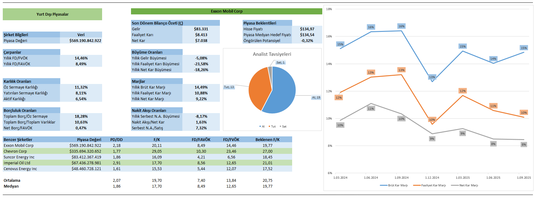 Exxon Mobil, $563 milyar üzerinde piyasa değeriyle sektörün en büyük oyuncularından biridir. Şirketin PD/DD (Fiyat/Defter Değeri) oranı 2,16 seviyesinde olup, bu değer sektör ortalaması olan 2,05'in biraz üzerinde seyretmektedir. Bu, yatırımcıların şirketin defter değerine göre daha yüksek bir değer biçtiğini, ancak aşırı bir prim taşımadığını göstermektedir. Benzer şekilde, F/K (Fiyat/Kar) oranı 19,91 ile medyanın hafif üzerinde ve sektör ortalamasına yakın seyretmektedir. Bu durum, yatırımcıların Exxon Mobil’in karlılığını ve büyüme potansiyelini olumlu gördüğünü işaret eder. Ancak, daha yüksek FD/FAVÖK oranı (14,46) ile şirketin faaliyet karına göre fiyatlanmasının sektör ortalamasından (13,84) biraz yüksek olduğu da dikkat çekmektedir.