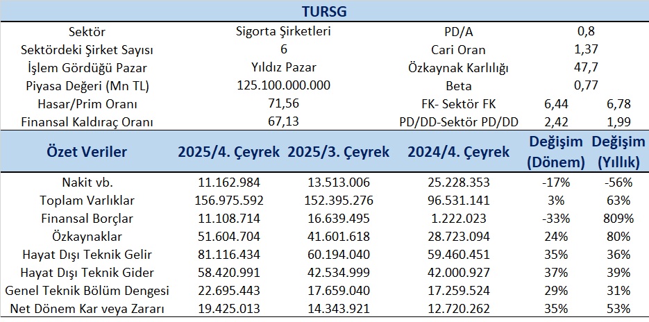TURSG 4 çeyrekte bir yıl önce aynı döneme göre karlılığını yaklaşık %65 artırarak konsensüsün (4,72 Milyar TL) üzerinde 5,08 Milyar TL’ye çıkartmıştır. 2025 yılına ilişkin net kâr ise yüzde 53 artışla 19,4 milyar TL’ye yükseldi. Özsermaye kârlılığı ise yüzde 48 seviyesinde gerçekleşti. 4Ç25 döneminde toplam brüt prim üretimi yıllık yüzde 46 artışla 41.982 milyon TL olurken; 2025 yılı toplam brüt prim üretimi yüzde 45 artışla 147 milyar TL olarak gerçekleşti.