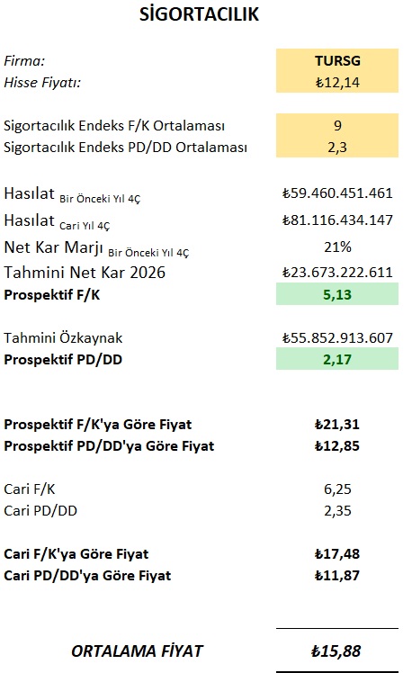 TURSG’nın son çeyrek 2025/4 verileri incelendiğinde sektör F/K oranın 5,75 olmasına karşılık 6,08 bir F/K’ya sektör PD/DD oranın 2,31 olmasına karşılık 2,29’lik bir PD/DD sahip olduğu gözlenmekte olup sektöre yakın hareket ettiğinin bir göstergesidir. Ayrıca Aswath Damodaran Avrupa bölgesindeki sigorta şirketlerinin (HAYAT DIŞI) ortalama fiyat kazanç oranının 18,65 ve beklenen F/K oranın ise 12,51olarak tahmin edilmesi ile yine PD/DD oranı Avrupa şirketleri ortalaması 1,80 olup TURSG için daha önce verdiğimiz 15,64 TL hedef fiyatımızı koruyoruz…