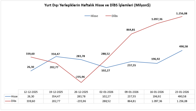 19 - 23 Ocak haftasında yurt dışında yerleşik kişilerin piyasa fiyatı ve kur hareketlerinden arındırılmış hisse senetleri net değişimi 490 milyon 580 bin dolar olarak gerçekleşirken yurt dışında yerleşik kişilerin piyasa fiyatı ve kur hareketlerinden arındırılmış DİBS (Kesin Alım) net değişimi 1 milyar 256 milyon 080 bin dolar olarak gerçekleşti.