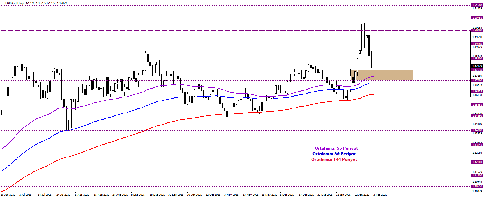EURUSD paritesi, güncel dönemde sert geri çekilme hareketlerine rağmen pozitif görünümünü sürdürmeye devam ediyor. 55 periyotluk ortalamanın destek olarak öne çıktığı 1,1700 – 1,1763 bölgesi üzerinde kalıcılık sağlandığı sürece, yukarı yönlü hareketin devam ederek 1,2000 seviyesinin yeniden gündeme gelme ihtimali güç kazanabilir. Buna karşın, söz konusu bölgenin altına kalıcı bir geçiş yaşanması durumunda satış baskısı artabilir ve 1,1555 seviyesinin yeniden test edilmesi olası hale gelebilir.