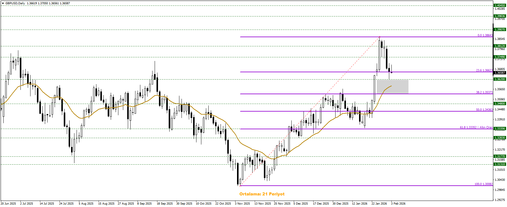 GBPUSD paritesi, Ocak sonundan itibaren güçlü bir yükseliş hareketi gerçekleştirdikten sonra kar realizasyonlarıyla geri çekilmesine rağmen pozitif görünüm sürüyor. 21 periyotluk hareketli ortalamanın geçtiği 1,3600-1,3630 bölgesinde önemli bir eşik alanı oluşturmuş durumda. Bu bölge, aynı zamanda Fibonacci %38,2 düzeltme seviyesine denk gelerek dikkat çekiyor. Parite 1,3600-1,3630 üzerinde fiyatlandığı sürece yeniden 1,3846 seviyelerine doğru toparlanma görülebilir; ancak bu bölgenin altında kalıcılık sağlanması halinde 1,3335 seviyesine doğru daha derin bir geri çekilme riski gündeme gelebilir.