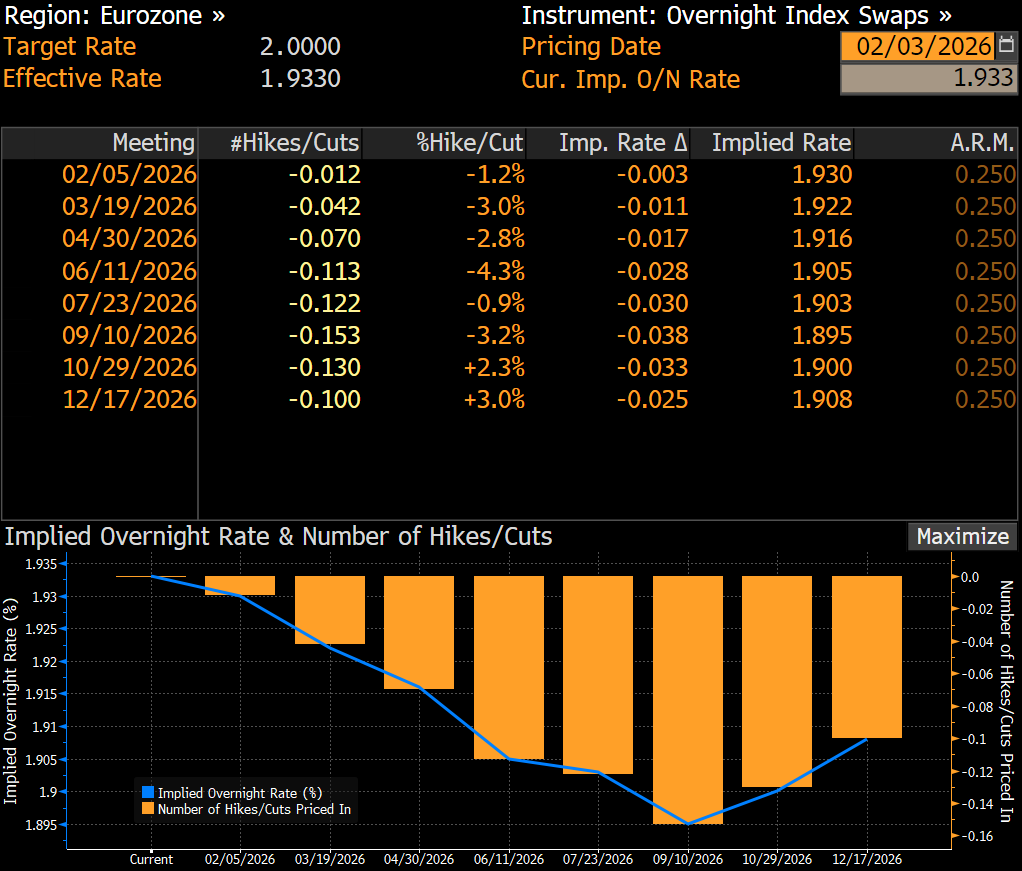 Swap piyasaları, ECB’nin 2026 boyunca politika faizini %2’de seviyesinde koruyacağı beklentisini yansıtırken, kurumumuz da 5 Şubat 2026 toplantısında faizlerin sabit kalacağını öngörüyor.