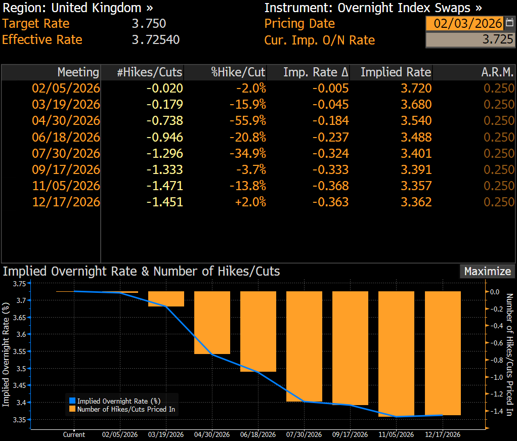 Swap piyasaları, BoE’nin 2026 yılının ilk yarısında faiz indirimlerine devam edebileceğini, ancak hızlı bir gevşeme sürecinin beklenmediğini gösterirken, kurumumuz da 5 Şubat 2026 toplantısında faizlerin sabit kalmasınu öngörüyor.