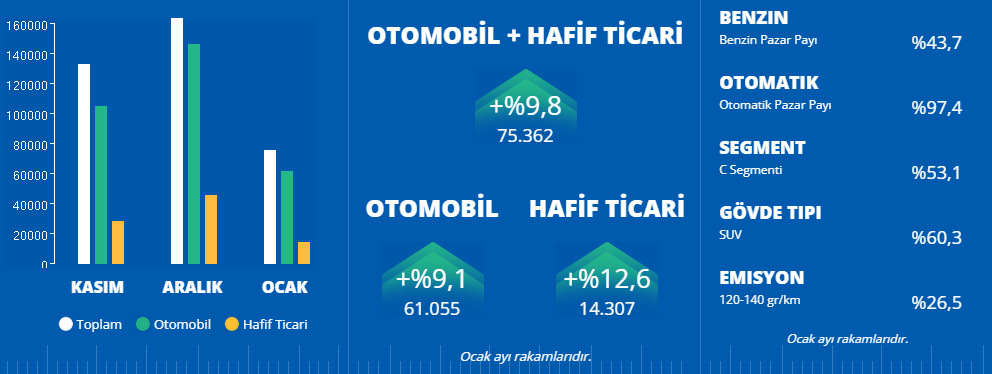 Türkiye otomobil ve hafif ticari araç toplam pazarı, 2026 yılı Ocak ayında bir önceki yılın aynı ayına göre %9,77 oranında artarak 75.362 adet olarak gerçekleşti. Otomobil satışları, 2026 yılı Ocak ayında geçen yıla göre %9,14 oranında artarak 61.055 adet, hafif ticari araç pazarı ise %12,56 artarak 14.307 adet oldu.