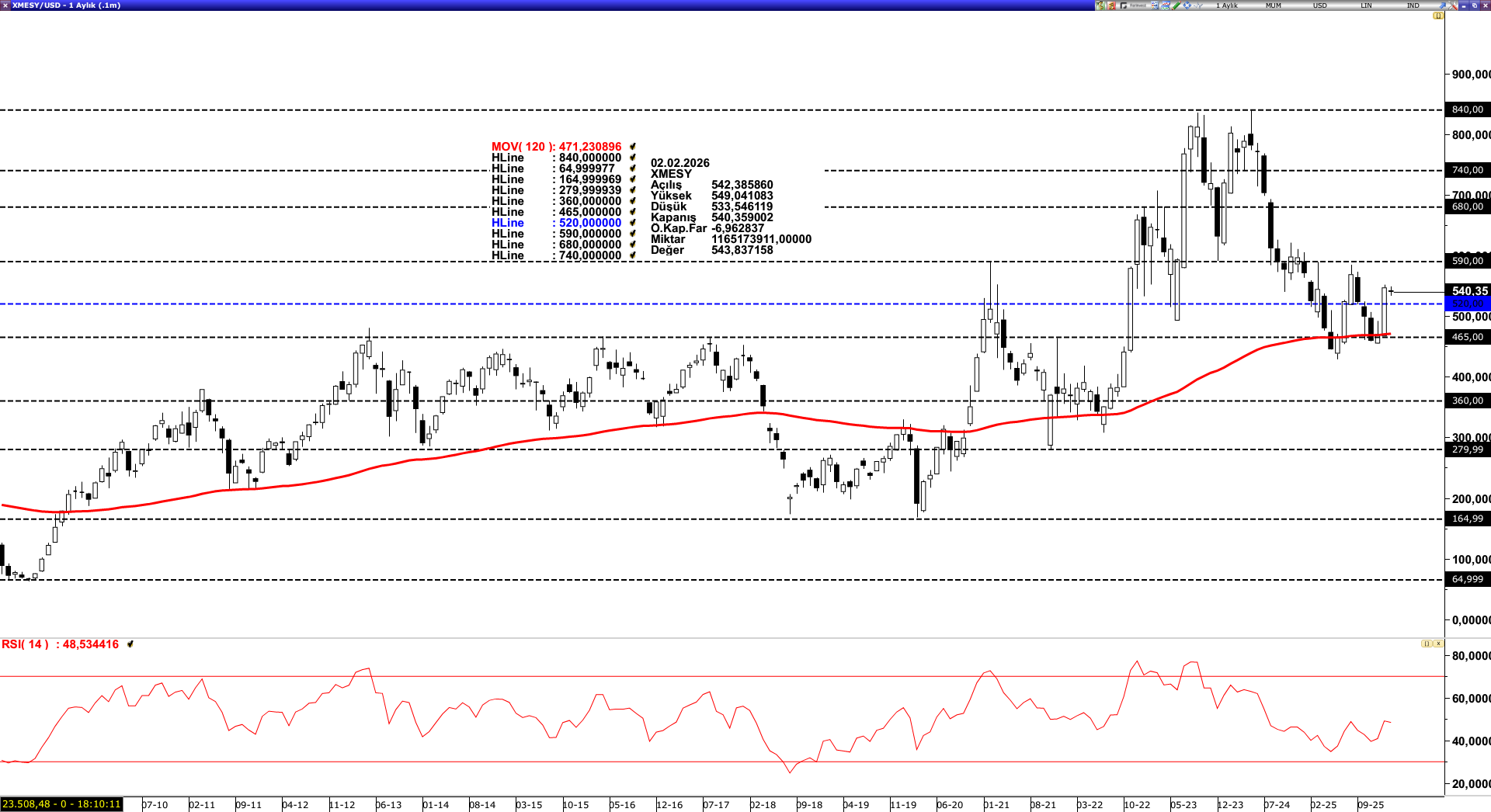 Teknik Bakış; Son dönemde 120 aylık ortalama (471,23) bölgesine baskı gören sektör, 120 aylık ortalamadan aldığı destekle 520,00 dolar direnci üzerinde fiyatlama sergilemektedir. Yukarı yönlü hareketin sürdürülebilmesi açısından 520 dolar seviyesinin üzerinde kalıcılık önemini koruyor. Bu seviyenin üstünde kaldığı sürece, fiyatın yeniden 590 dolar direnç seviyesine doğru ivme kazanması beklenebilir. Öte yandan, olası aşağı yönlü baskılarda 520 dolar seviyesi ilk destek olurken altına inilmesi halinde realizasyon süreci derinleşerek 120 aylık ortalama (471,23) seviyesinin gündeme gelme riskini artırabilir.