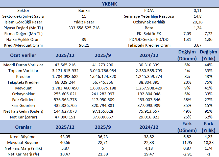 YKBNK’nin varlıklarının 2025 yılı son çeyreği dahil bir önceki yılın aynı dönemine göre %33 büyüdüğü görülürken bir önceki döneme göre de (202503) %4 arttığı izlenmektedir. Takipteki kredilerin ise bir önceki yılın aynı dönemine göre %75 arttığı gözlenmiş olup dikkat edilmesi gereken bir oran karşımıza çıkmaktadır. Kredi mevduat oranın ise %96’larda oluşması pozitif karşılanmaktadır. Kredi büyümeleri çeyreksel olarak ortalamada %43’lerde oluşurken Mevduat büyümelerinin ortalamasının ise daha değişken bir yapıda olması dikkat çekmektedir. Diğer taraftan net faiz marjlarının yıllıklandırılmış bazda artıyor olması pozitif unsurlar arasında yer almaktadır. Faiz gelirleri yıllık bazda %27 artarken bir önceki döneme göre de %38 büyümüştür. Net kar yıllık bazda kümülatifte %62 artış gösterirken çeyreksel bazda daha düşük kalması vergi etkisine bağlanmaktadır.