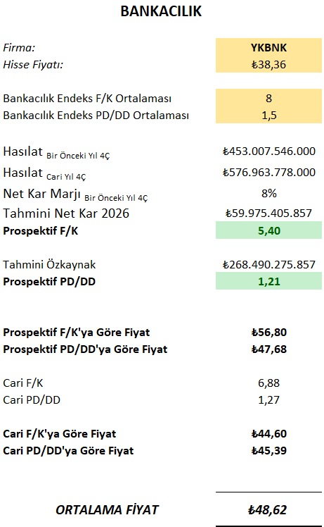 YKBNK Bankası için yaptığımız göreceli değerleme yaklaşımına göre F/K (7,09-7,8) oranına göre ve PD/DD (1,31-1,36) oranına göre hedef fiyatlamanın 48 TL çıktığı görülmektedir.