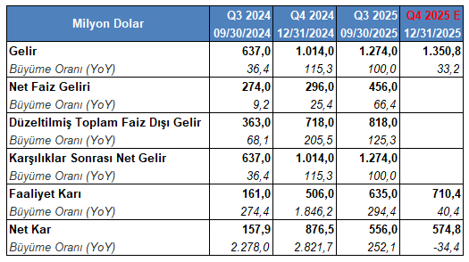 Net karın 574,8 milyon dolar tutarında sonuçlanması öngörülüyor. Beklenti aralığı en yukarıda 657 milyon dolar ve en aşağıda 504 milyon dolar olarak yer buluyor.