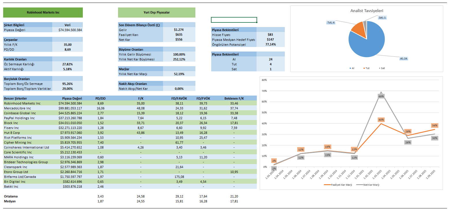 Robinhood bu görünümle, piyasa tarafından 74 milyar doların üzerinde bir değere sahip. Şirketin cari F/K rasyosu 35 çarpana ve PD/DD oranı ise 8,69 oranına sahip. Ayrıca şirketin FD/FVÖK rasyosu ise 39,73 oranında bulunuyor. Bu üç çarpan göz önüne alındığında Robinhood benzerlerinin medyan değerinden daha yüksek bir değerde konumlanıyor.