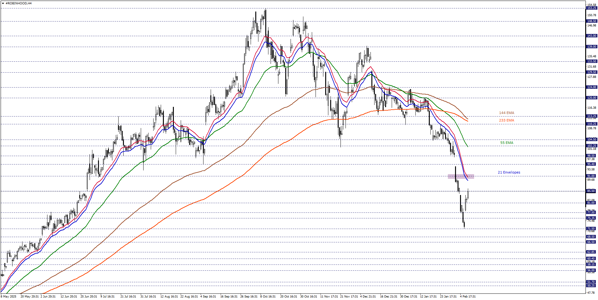 Robinhood hisse fiyatını kısa vadede teknik açıdan değerlendirdiğimizde, 21 periyotluk Envelopes’un desteklediği 91,00 seviyesini takip etmekteyiz. Hisse fiyatı ilgili seviye altında kaldığı sürece, negatif eğilim ön planda durabilir. Düşüşlerin sürmesi durumunda 81,00 ve 77,50 destekleriyle karşılaşılabilir.