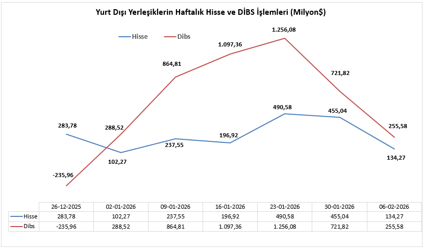 2 – 6 Şubat haftasında yurt dışında yerleşik kişilerin piyasa fiyatı ve kur hareketlerinden arındırılmış hisse senetleri net değişimi 134 milyon 270 bin dolar olarak gerçekleşirken yurt dışında yerleşik kişilerin piyasa fiyatı ve kur hareketlerinden arındırılmış DİBS (Kesin Alım) net değişimi 255 milyon 580 bin dolar olarak gerçekleşti.
