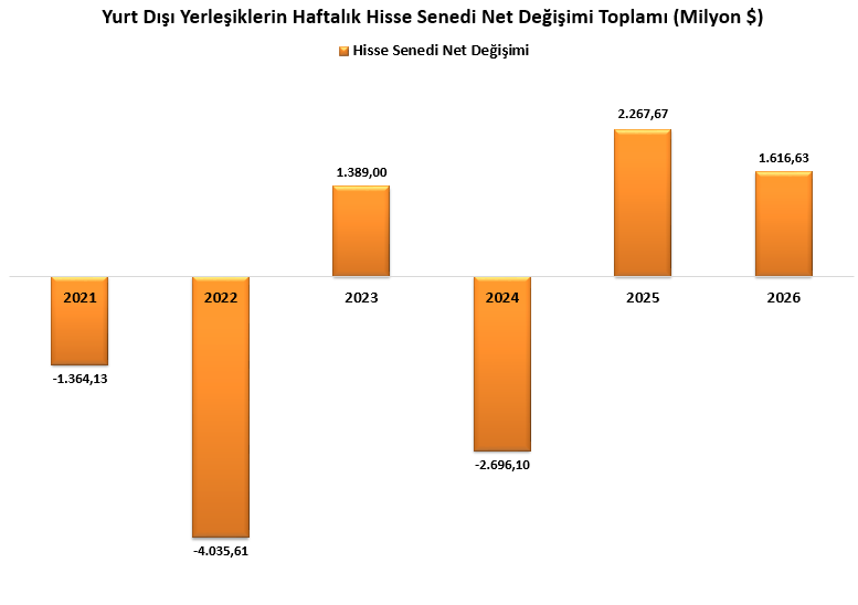 Yıllık bazda hisse senedi net değişimlerine ayrıca bakıldığında, yabancı yatırımcıların 2021 ve 2022 yıllarında hisse senetlerinde net satım gerçekleştirdiği, 2023 yılında ise alım tarafında yer aldığı görülmektedir. 2024 yılı da 2021 ve 2022’ye benzer şekilde net satımla negatif tarafta tamamlanmıştır. 2025 yılında ise dikkat çekici bir artışla yabancı yatırımcıların yeniden alım tarafında yer aldığı görülmektedir. Diğer yandan, 2026 yılının başından itibaren 6 Şubat ile biten hafta itibarıyla hisse senetlerinde 1,61 milyar dolar tutarında alım gerçekleştiği izlenmektedir.
