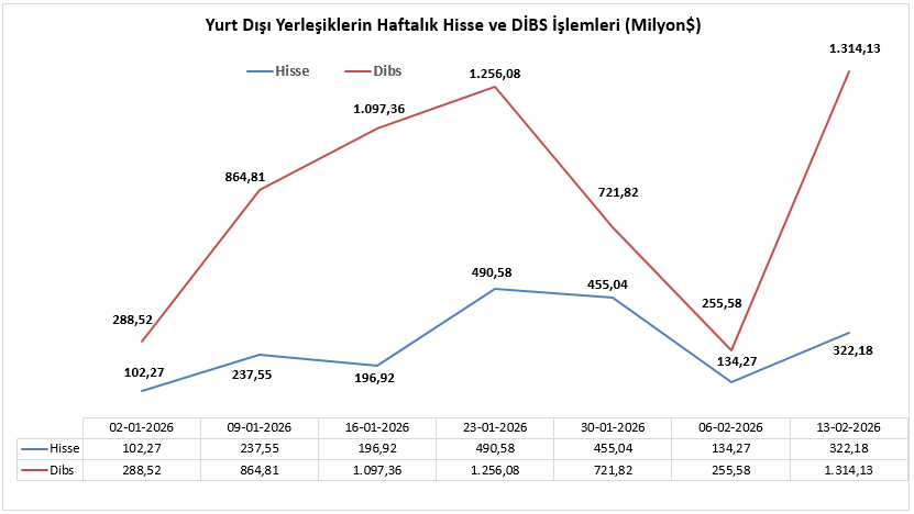 Son altı haftalık verilerde ise, hisse senetlerinde 1 milyar 836 milyon 540 bin dolarlık alım izlenirken yılın başından itibaren 13 Şubat ile biten haftayla birlikte 1,93 milyar dolarlık alım gerçekleşmiş oldu. DİBS (Kesin Alım) tarafında ise son altı hafta da 5 milyar 509 milyon 780 bin dolarlık alım gerçekleşirken yılın başından itibaren 13 Şubat ile biten haftayla birlikte 5,79 milyar dolarlık alım gerçekleştiği görüldü.