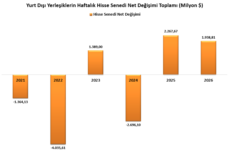 Yıllık bazda hisse senedi net değişimlerine ayrıca bakıldığında, yabancı yatırımcıların 2021 ve 2022 yıllarında hisse senetlerinde net satım gerçekleştirdiği, 2023 yılında ise alım tarafında yer aldığı görülmektedir. 2024 yılı da 2021 ve 2022’ye benzer şekilde net satımla negatif tarafta tamamlanmıştır. 2025 yılında ise dikkat çekici bir artışla yabancı yatırımcıların yeniden alım tarafında yer aldığı görülmektedir. Diğer yandan, 2026 yılının başından itibaren 13 Şubat ile biten hafta itibarıyla hisse senetlerinde 1,93 milyar dolar tutarında alım gerçekleştiği izlenmektedir.