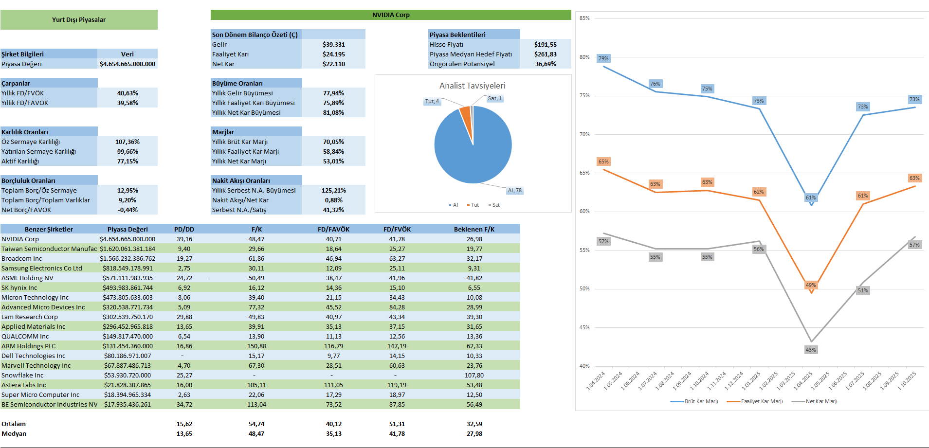 Bu yapıyla Nvidia, 4,6 trilyon doları aşan değeriyle, yarı iletken hisse senetleri arasında en yüksek piyasa değerine sahip olma konumunu koruyor. Şirket 48,47 cari F/K çarpanıyla, benzerlerinin oluşturduğu medyan değerde işlem görüyor. Nvidia’nın FD/FAVÖK rasyosu 40,71 çarpan ile medyan değerin üzerinde konumlanıyor. Büyüme beklentilerinin dahil edildiği beklenen F/K rasyosu ise medyan değerin altında bir konuma sahip.