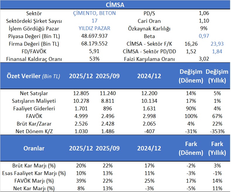 Çimsa Çimento (CIMSA) 2025 4.Çeyrek Bilanço Analizi