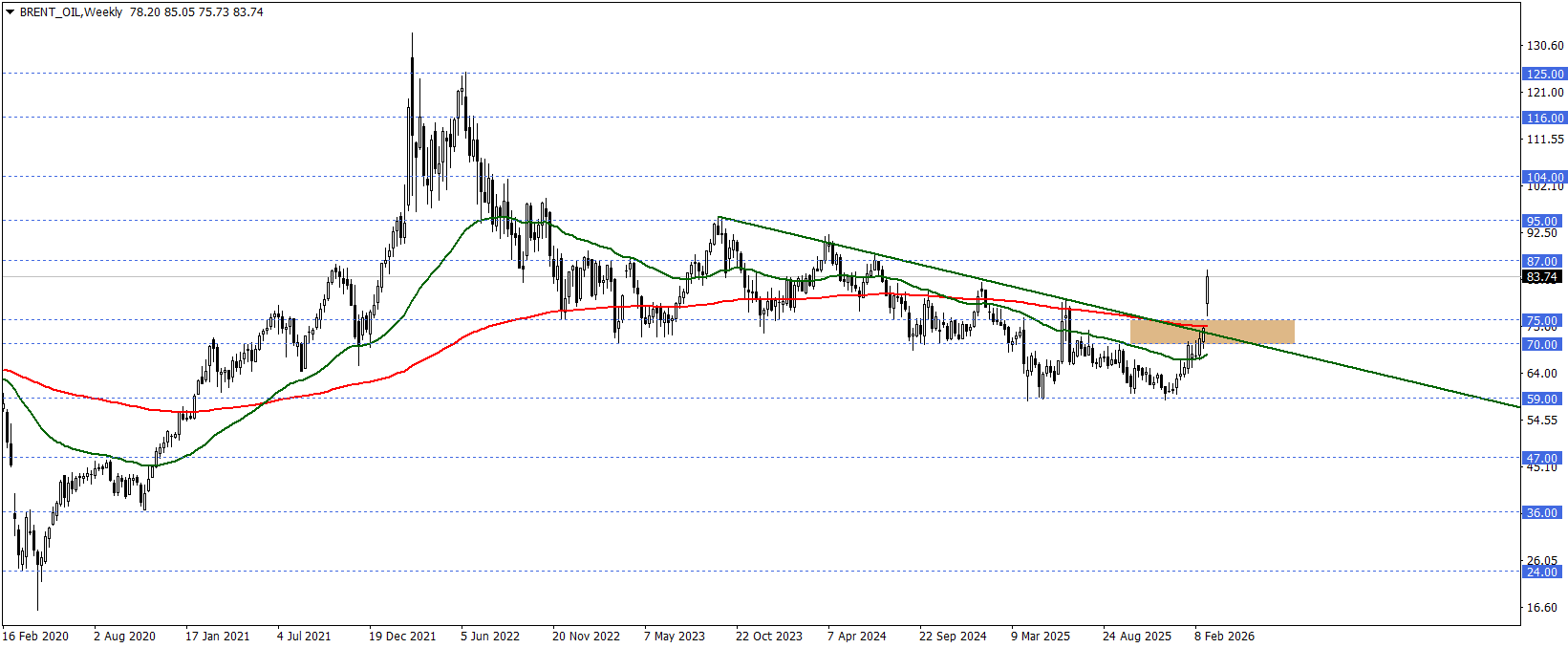 Bu aşamada oluşabilecek düzeltmelerin 70 – 75 dolar bölgesini test etmesi, savaş senaryosu tersine dönmediği sürece pek gerçekçi olmayabilir. 75 – 87 dolar bölgesinde oluşabilecek düzeltmeler, 70 dolar altına kadar ulaşacak ve günlük kapanışlarla desteklenecek olursa, bu durumda 59 seviyesi gündeme gelebilir.