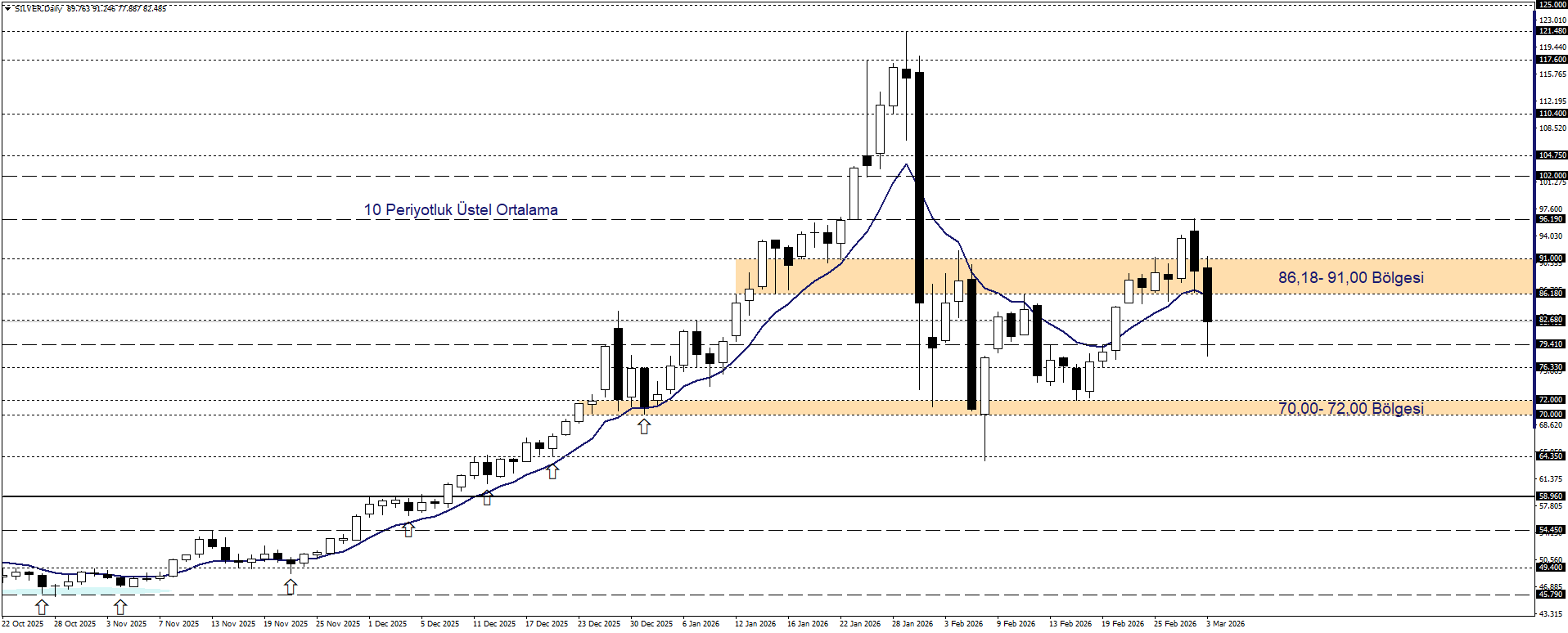Savaş sonrası iki seansta da satış baskısıyla karşılaşan gümüşte, altına benzer şekilde düzeltme eğilimi öne çıktı. Ancak gümüşün sanayi metali niteliği nedeniyle büyüme beklentilerine daha duyarlı olması ve altına kıyasla daha oynak hareket etmesi, fiyatlamaların daha sert gerçekleşmesine neden oldu. Son iki günde 10 periyotluk üstel ortalamanın ve 86,18–91,00 bandının altına gerileyen fiyatlar, kısa vadede zayıf bir teknik görünüm sergilese de mevcut seviyelerin hala bir geri çekilme bölgesine işaret ettiği söylenebilir. Yukarı yönlü ivmenin yeniden güç kazanabilmesi için 86,18–91,00 aralığı üzerinde günlük kapanışların görülmesi kritik olacak. Bu durumda 96,19 ve ardından 102 seviyesi yeniden gündeme gelebilir.