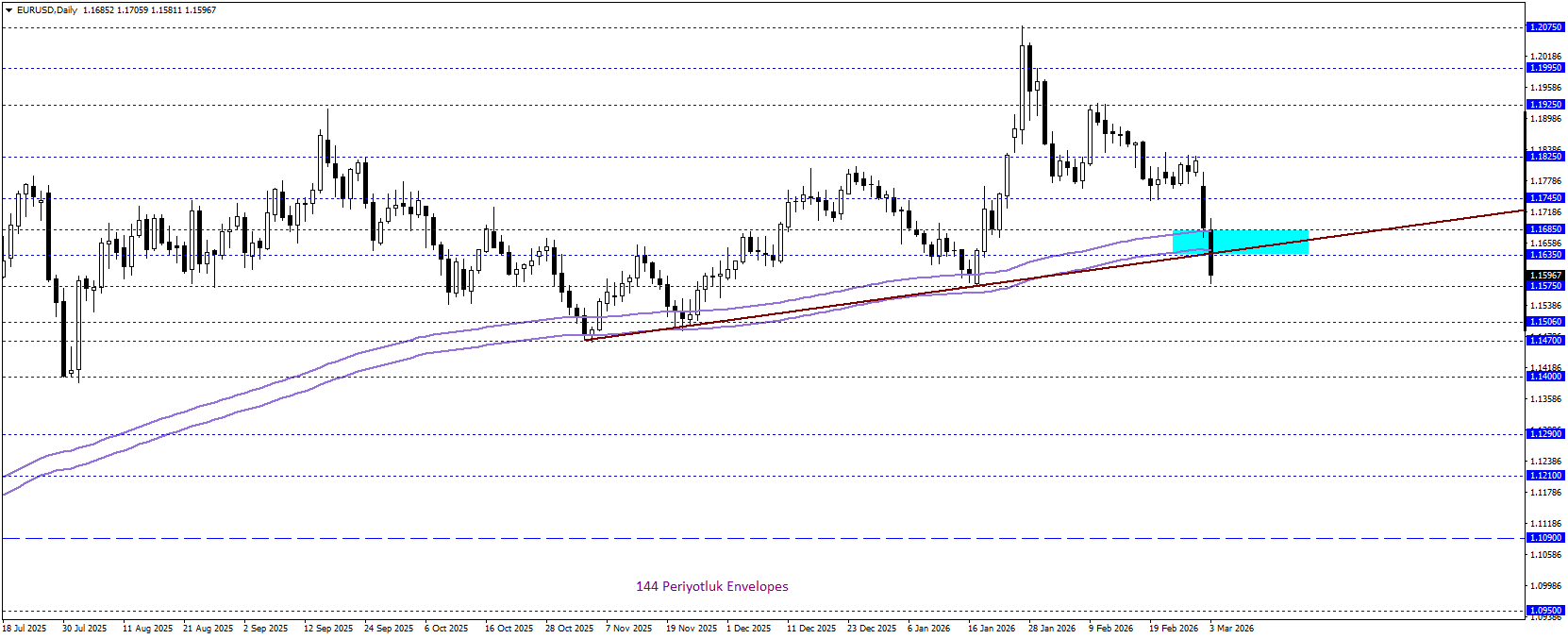 EURUSD paritesi, aylık bazda yaklaşık %1,80 değer kaybederek düşüş eğilimini pekiştirirken 144 günlük envelopes altında zayıf teknik görünümünü korumaya devam ediyor. Fiyatın, aynı zamanda Envelopes göstergesinin destek ayağı olduğu 1,1635–1,1685 bölgesinin altında kalması, aşağı yönlü momentumun canlı ve kararlı olduğunu ortaya koyuyor. Bu eşik ve mevcut trend yapısı aşılamadığı sürece satış baskısının derinleşerek 1,1400 seviyesine doğru genişleme potansiyeli güçlü kalmayı sürdürüyor. Buna karşılık olası toparlanmalarda 1,1635–1,1685 bandı kritik bir dönüm noktası niteliğinde; bu bölge üzerinde sağlanacak kalıcılık, düşüş senaryosunu zayıflatabilir ve 1,1825 seviyesine doğru etkili bir tepki yükselişinin kapısını aralayabilir.