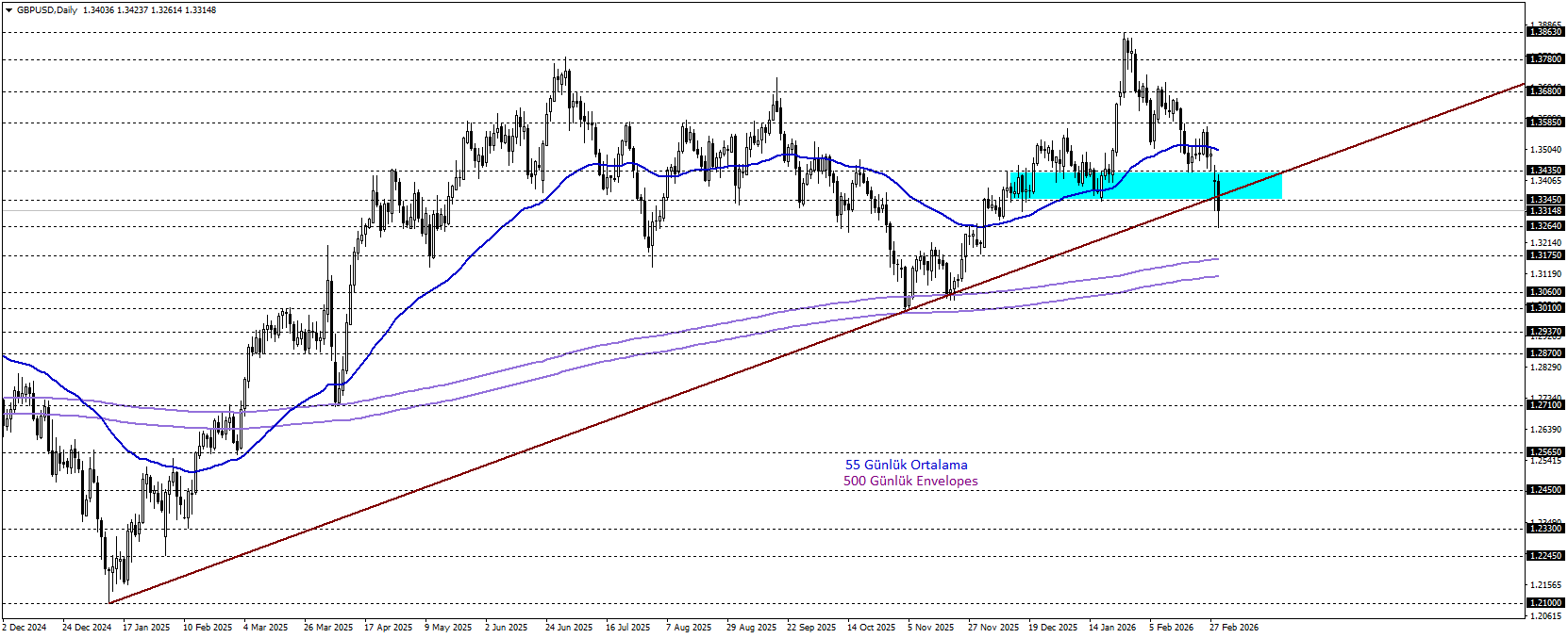 GBPUSD paritesi, Ocak sonundan bu yana süren düşüş eğilimini devam ettirirken, 55 günlük ortalamanın altında kalarak teknik olarak zayıf görünümünü koruyor. 1,3345–1,3435 bölgesi altında kaldığı sürece satış baskısı sürerek pariteyi 1,3010 seviyesine taşıyabilir. 500 periyotluk ortalamanın destek olarak işlev görmesi dikkat çekerken, olası tepki hareketlerinde kritik eşik yine 1,3345–1,3435 bandı oluyor. Bu bölge üzerinde kalıcılık sağlanırsa, düşüş senaryosunu ortadan kaldırabilir ve 1,3863 seviyesine doğru etkili bir toparlanmanın yolunu açabilir.