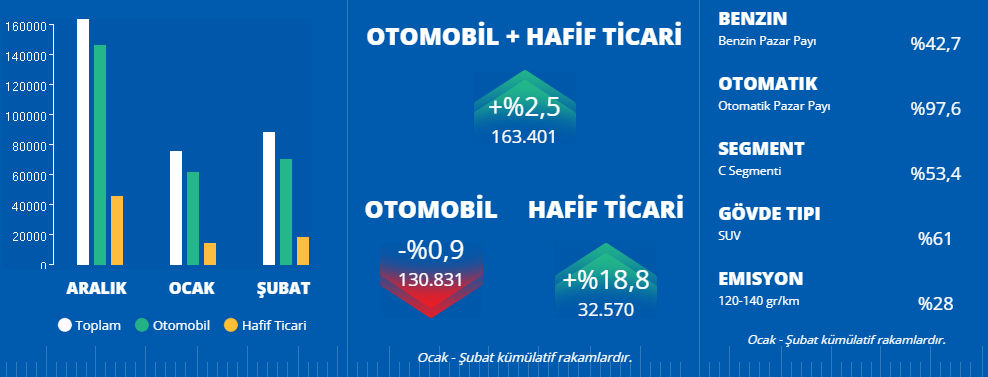 Türkiye otomobil ve hafif ticari araç toplam pazarı, 2026 yılı Ocak-Şubat döneminde bir önceki yılın aynı dönemine göre %2,52 oranında artarak 163.401 adet olarak gerçekleşti. Otomobil satışları, 2026 yılı Ocak-Şubat döneminde geçen yıla göre %0,86 oranında daralarak 130.831 adet, hafif ticari araç pazarı ise %18,79 artarak 32.570 adet oldu.