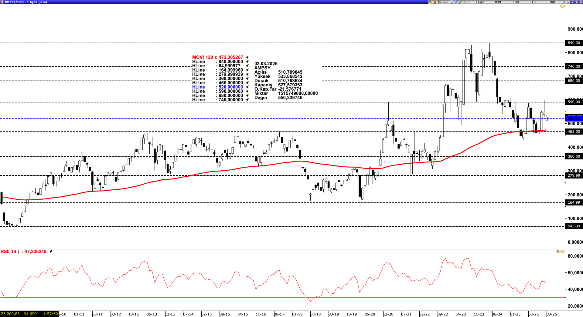 Teknik Bakış; Son dönemde 120 aylık ortalamadan (472,30 destek alarak pozitif ivme yakalayan sektör, 590 dolar direncinden bir miktar baskı gördü. Yukarı yönlü hareketin sürdürülebilmesi açısından 520 dolar seviyesinin üzerinde kalıcılık önemini korumakla birlikte sağlanması halinde, fiyatın yeniden 590 dolar direnç seviyesine doğru ivme kazanması beklenebilir. Öte yandan, olası aşağı yönlü baskılarda 120 aylık ortalama (472,30) seviyesi güçlü bir destek konumunda bulunuyor. Ancak bu seviyenin altına sarkılması halinde, realizasyon süreci derinleşerek 360 dolar seviyesinin gündeme gelme riskini artırabilir.